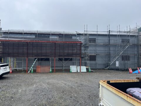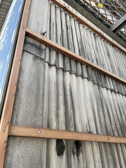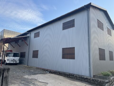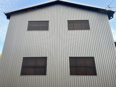 サッシ、古い明かり取りは全て撤去して新しくポリカ波板に変えてスレート外壁の部分は大型倉庫にマッチする大型の角波張り施工です。
